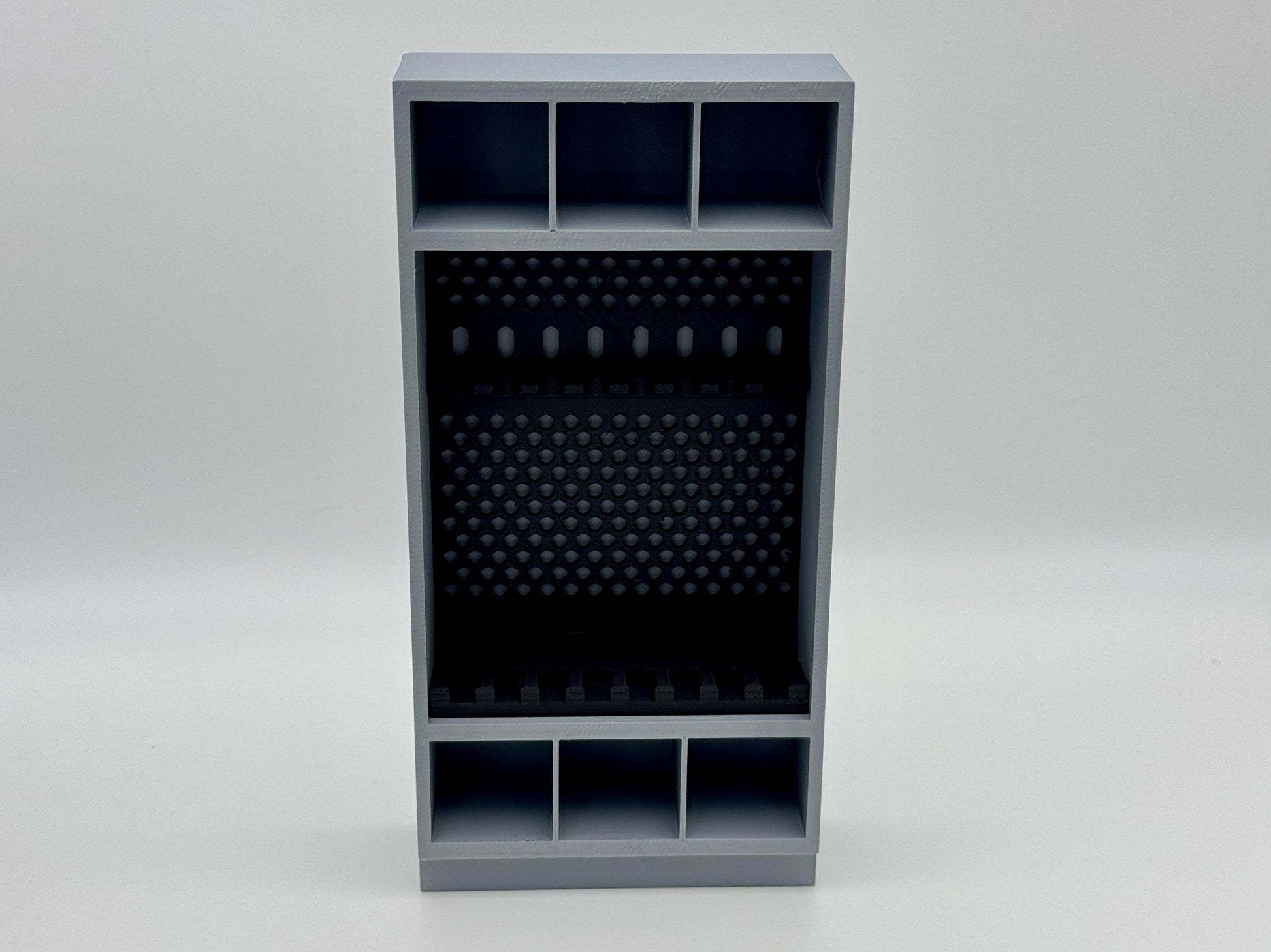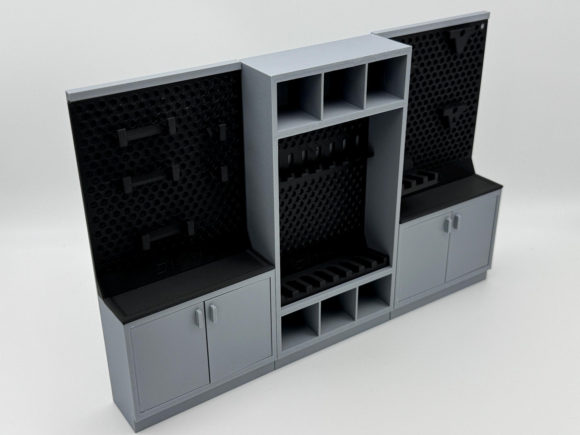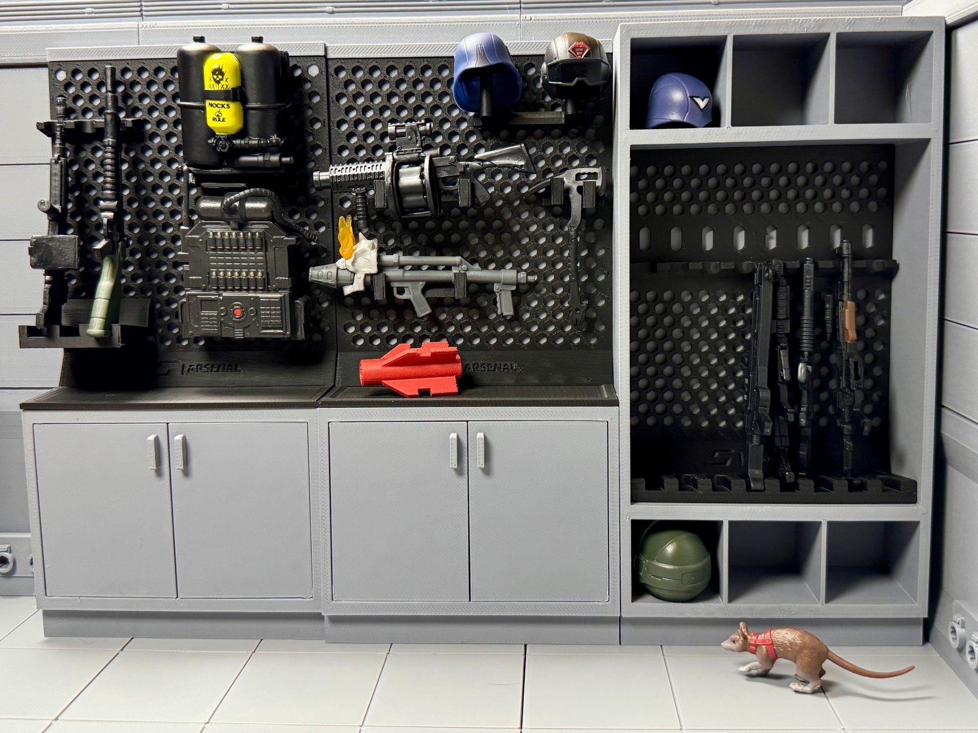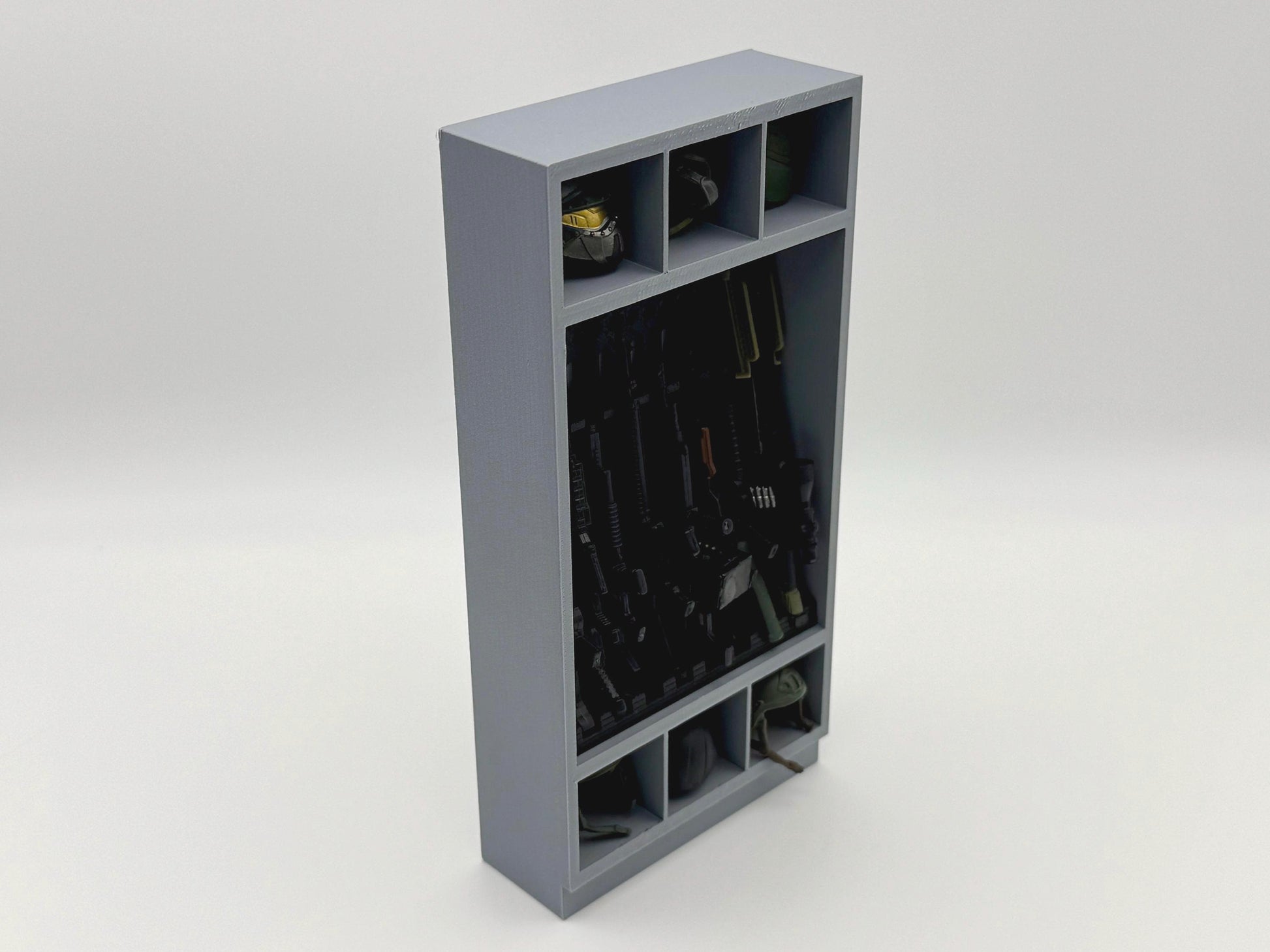 1:12 Scale accessories inspired by G.I. Joe Classified Series and part of an armory series with multiple sizes of cabinets and racks for your custom layouts. Features a long gun rack that holds up to 8 guns. 6 storage cubes sized perfectly for helmets. Additional accessories available.