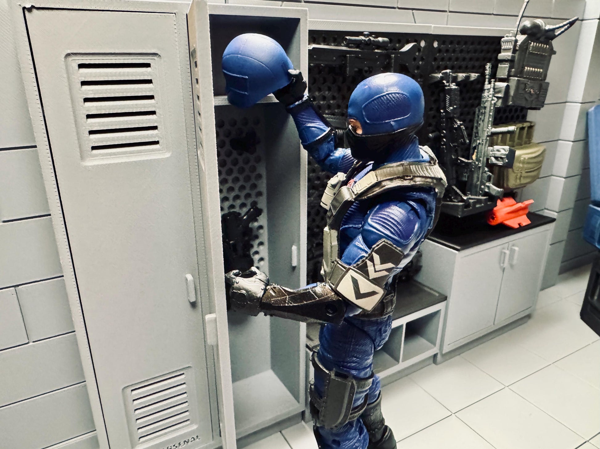 1:12 Scale accessories inspired by the G.I. Joe Classified Series are part of an armory series with multiple sizes of cabinets and racks for your custom layouts. It features 2 working doors and a peg for hooks and accessories.