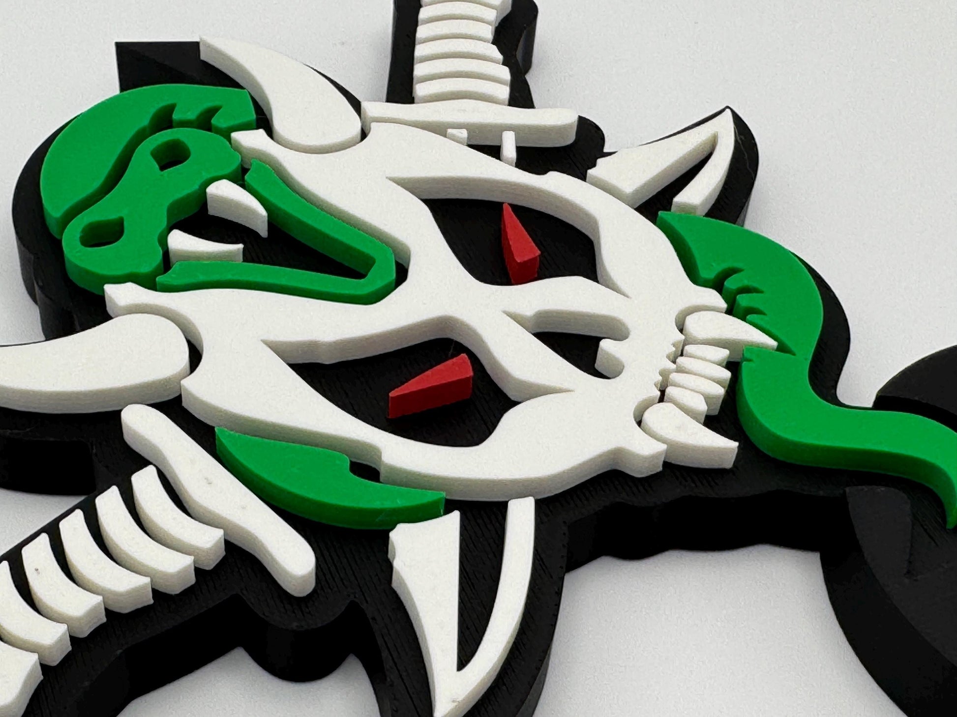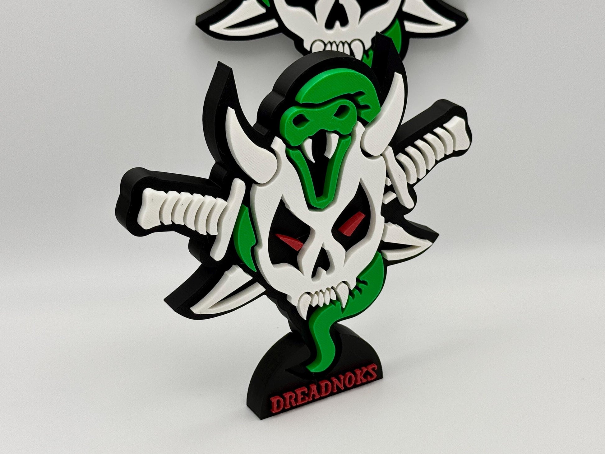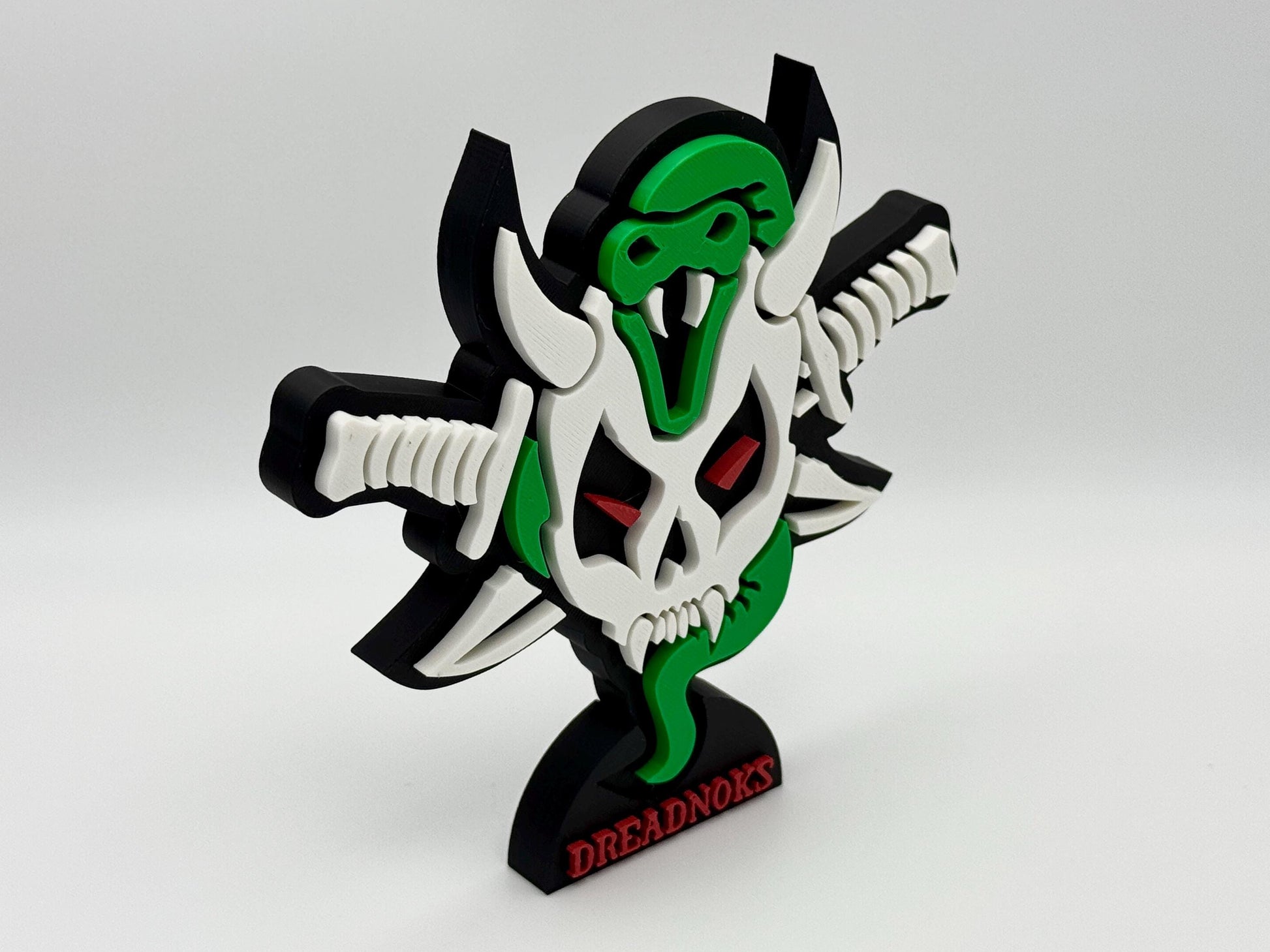 Add the Dreadnoks Logo to your desk, bookshelf, or display. Let the logo add some pop to your figure shelf or pictures. Custom 3D printed in 4 Colors. Stand is removable for wall display.