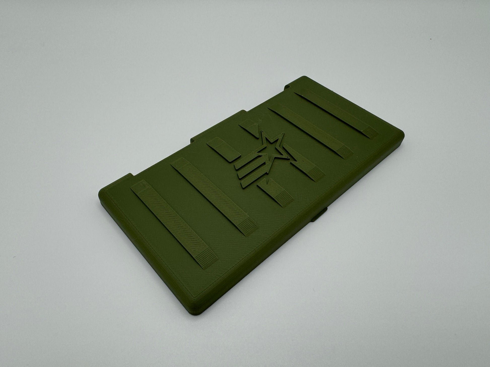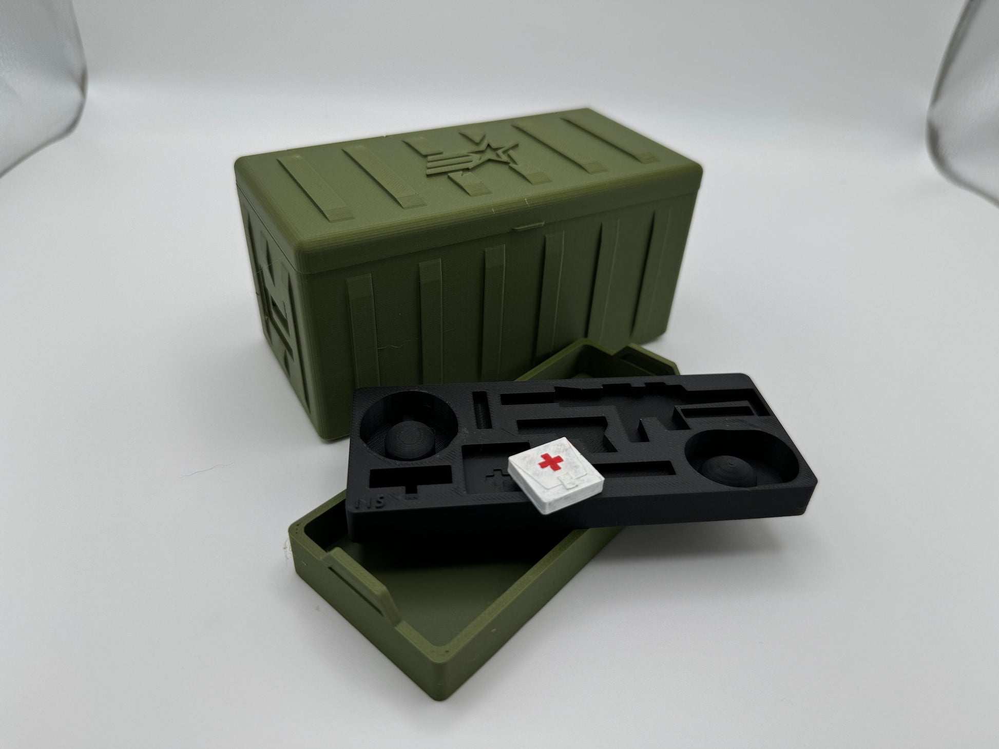 1:12 Scale crate is inspired by G.I. Joe Classified Series and is part of a series with multiple sizes that stack. The hinge is designed for the best possible look, utilizing a ball and socket hinge. The handles fold flush into the sides of the crate.