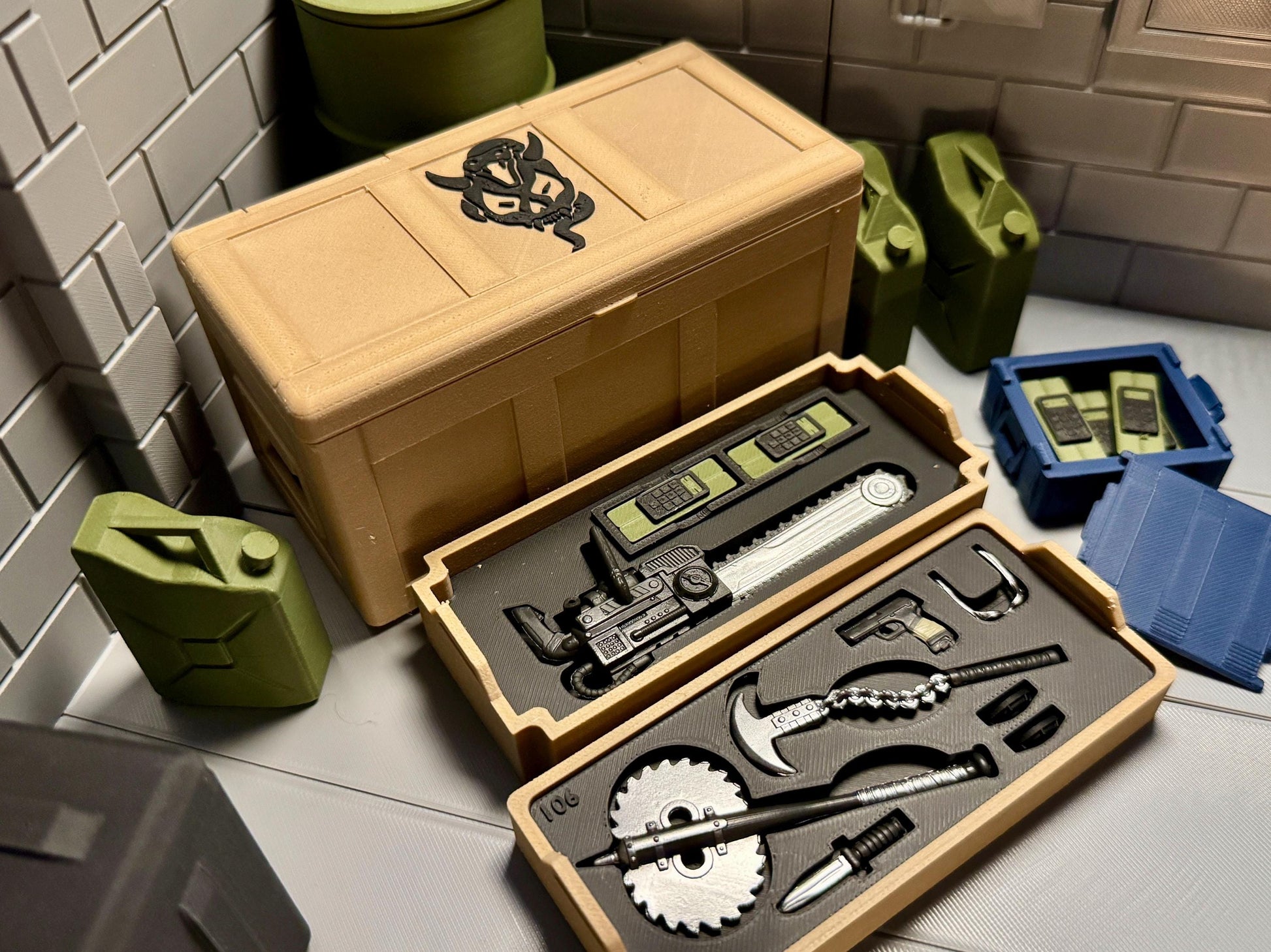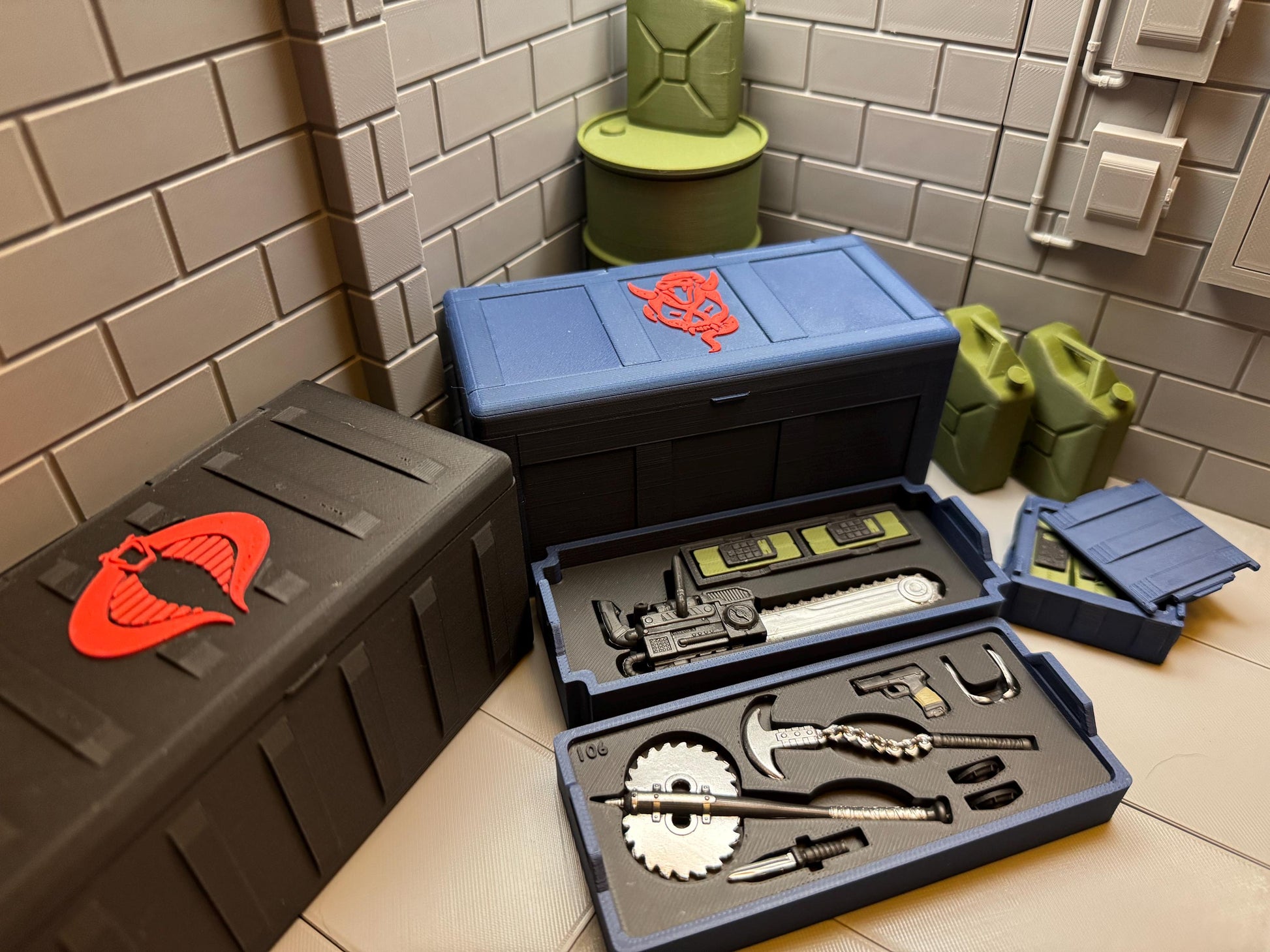1:12 Scale crate is inspired by G.I. Joe Classified Series and is part of a series with multiple sizes that stack. This Crate has a spot for all of Buzzer’s weapons, and accessories. The hinge is designed for the best possible look, utilizing a ball and socket hinge. The handles fold flush into the sides of the crate.