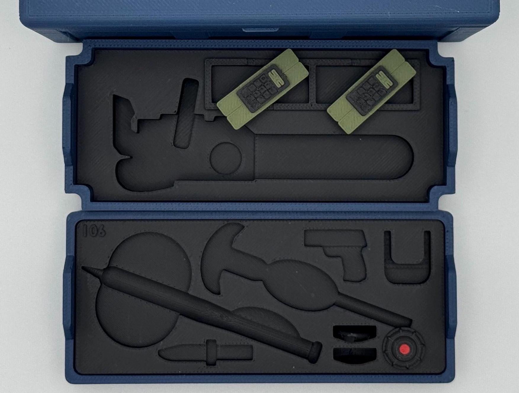 Includes: Body, Lid with Logo, 2 Trays, 2 Handles, and 2 character-specific tray insert ("Foam"), 2 Landmines, 2 C4 Packs