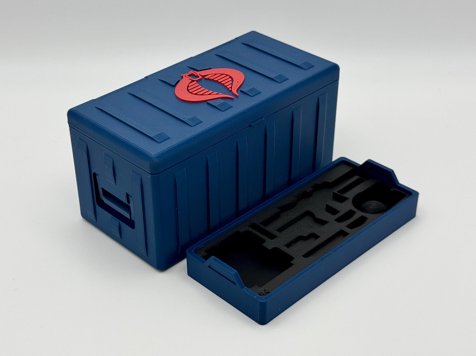 1:12 Scale crate is inspired by G.I. Joe Classified Series and is part of a series with multiple sizes that stack. The hinge is designed for the best possible look, utilizing a ball and socket hinge. The handles fold flush into the sides of the crate.