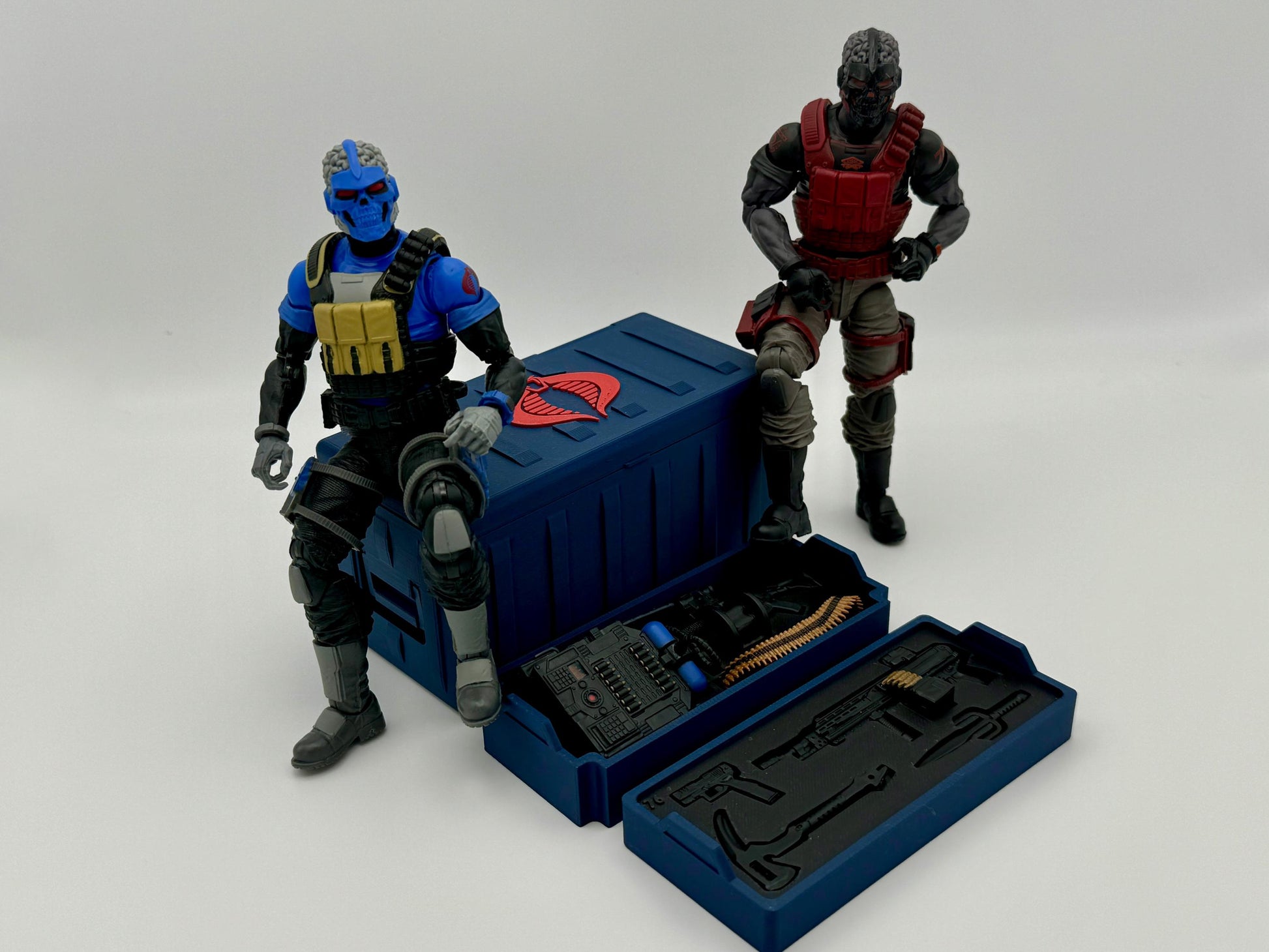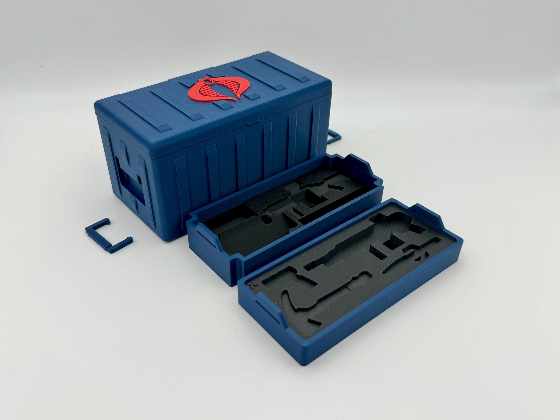 The 1:12 Scale crate is inspired by the G.I. Joe Classified Series and is part of a series with multiple sizes that stack. This Crate has a spot for all of the Range Viper’s weapons, accessories, and backpack. The hinge is designed for the best possible look, utilizing a ball-and-socket hinge. The handles fold flush into the sides of the crate.