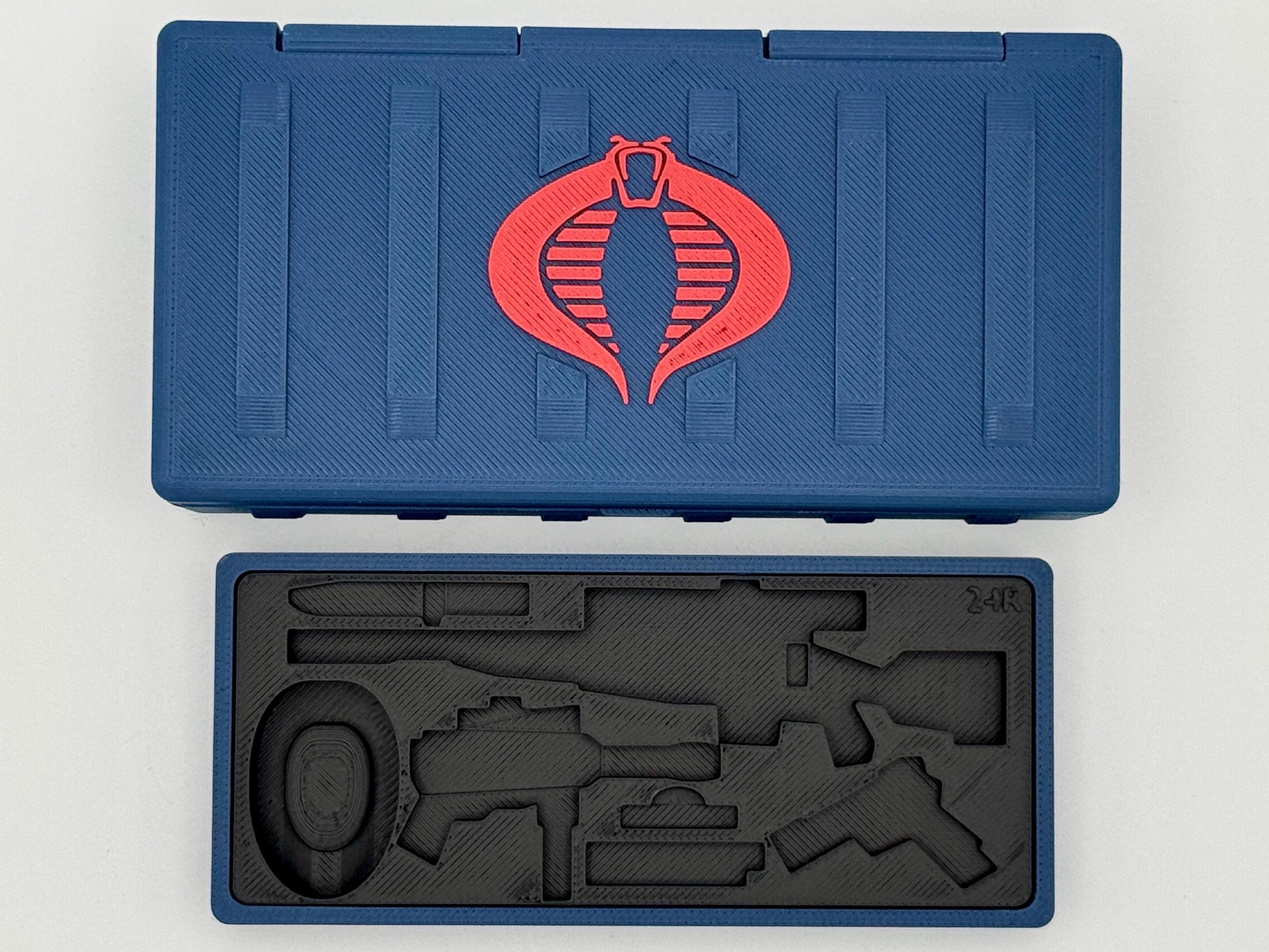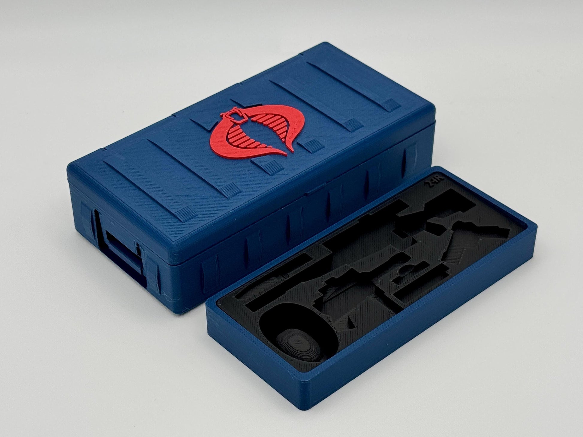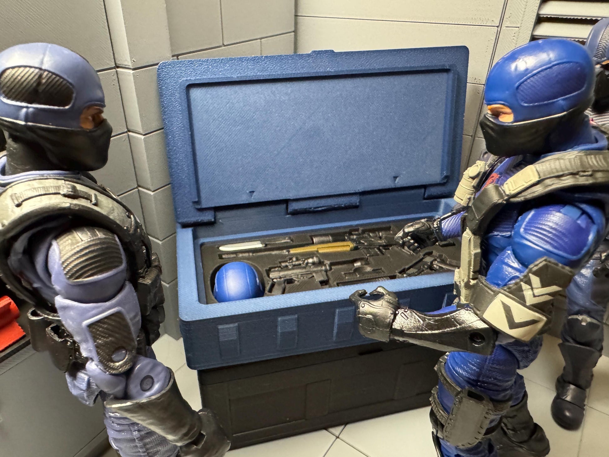 1:12 Scale crate is inspired by G.I. Joe Classified Series and is part of a series with multiple sizes that stack. The hinge is designed for the best possible look, utilizing a ball and socket hinge. The handles fold flush into the sides of the crate.