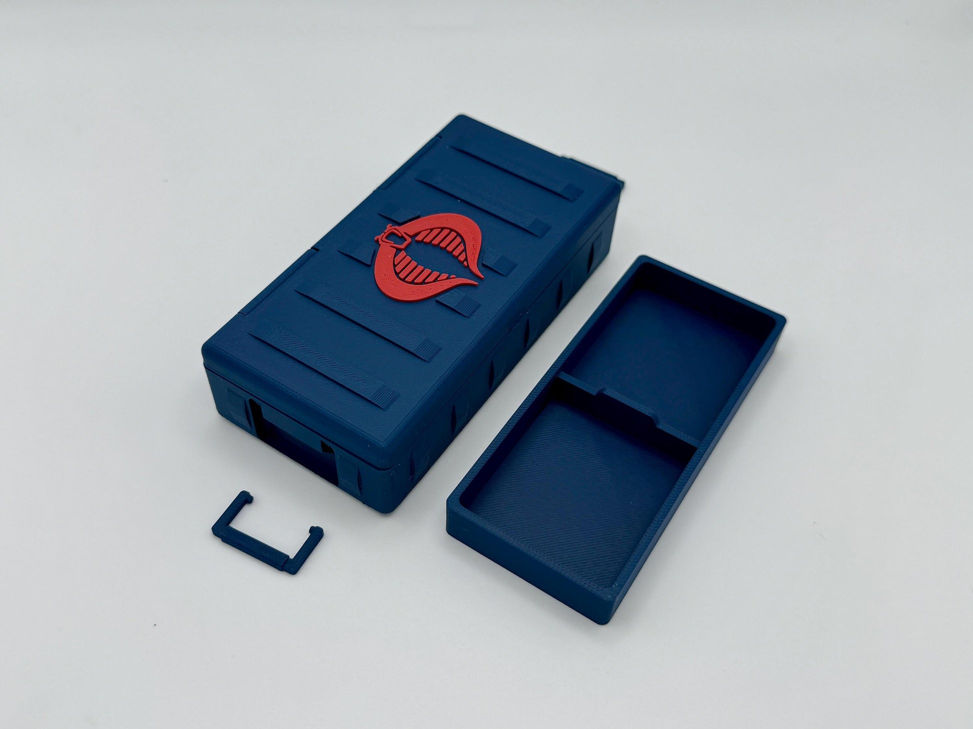 1:12 Scale crate is inspired by G.I. Joe Classified Series and is part of a series with multiple sizes that stack. The hinge is designed for the best possible look, utilizing a ball and socket hinge. The handles fold flush into the sides of the crate.
