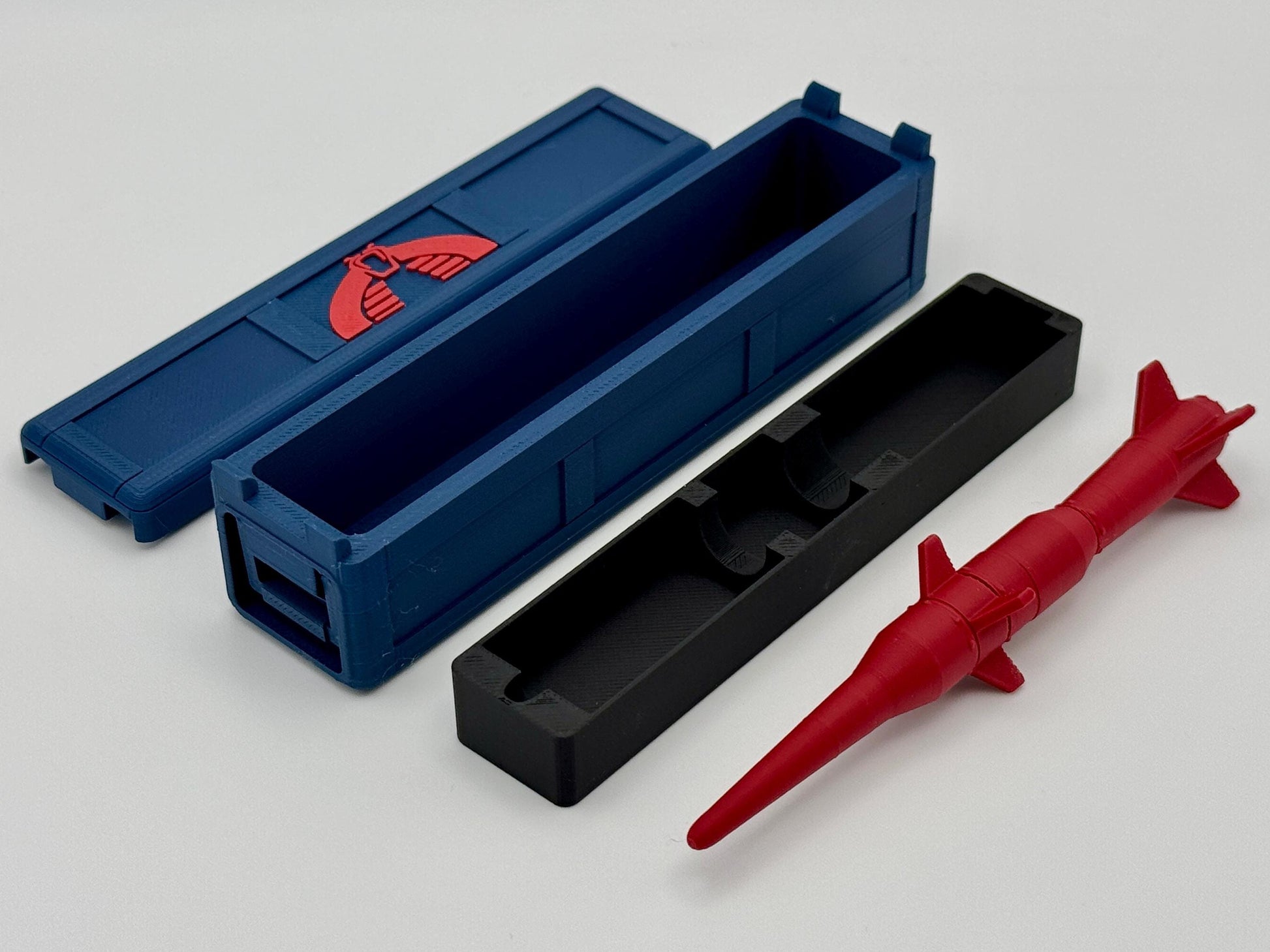 1:12 Scale accessories inspired by G.I. Joe Classified Series and is part of a multi-size stackable crate series. Don’t leave your Stinger fleet short on the field of battle, supply them with the missiles they need. This listing includes 1 missile that can be assembled /disassembled. The case holds the missile securely for transport. This missile matches the Hasbro missiles in size and shape. These are made for display and do not have mount slots. The Body-to-Lid notch secures the lid in place. The handles fold flush into the sides of the crate.