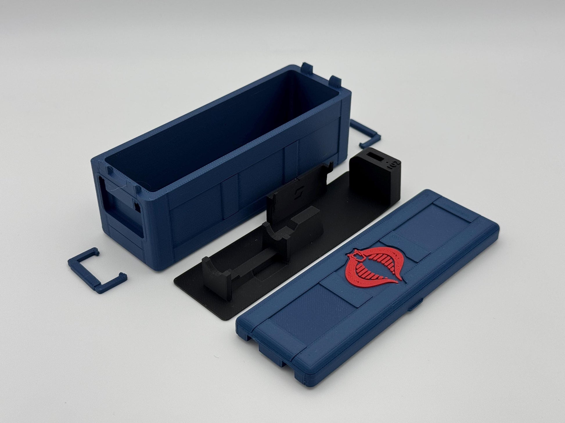 1:12 Scale crate is inspired by G.I. Joe Classified Series and is part of a multiple-size stacking crate series. This Crate has a rack for Ripper’s Jaws-of-Life, rifle, and a quick-access holder for his pistol. The Body-to-Lid notch secures the lid in place. The handles fold flush into the sides of the crate.