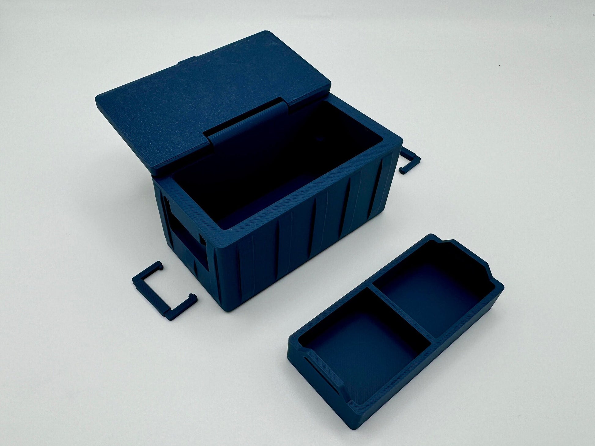 The 1:12 Scale crate is inspired by the G.I. Joe Classified Series and is part of a series with multiple sizes that stack. Standard Issue is smaller and more true-to-scale than the Special Mission Crates. The hinge is designed for the best possible look, utilizing a ball-and-socket hinge. The handles fold flush into the sides of the crate.