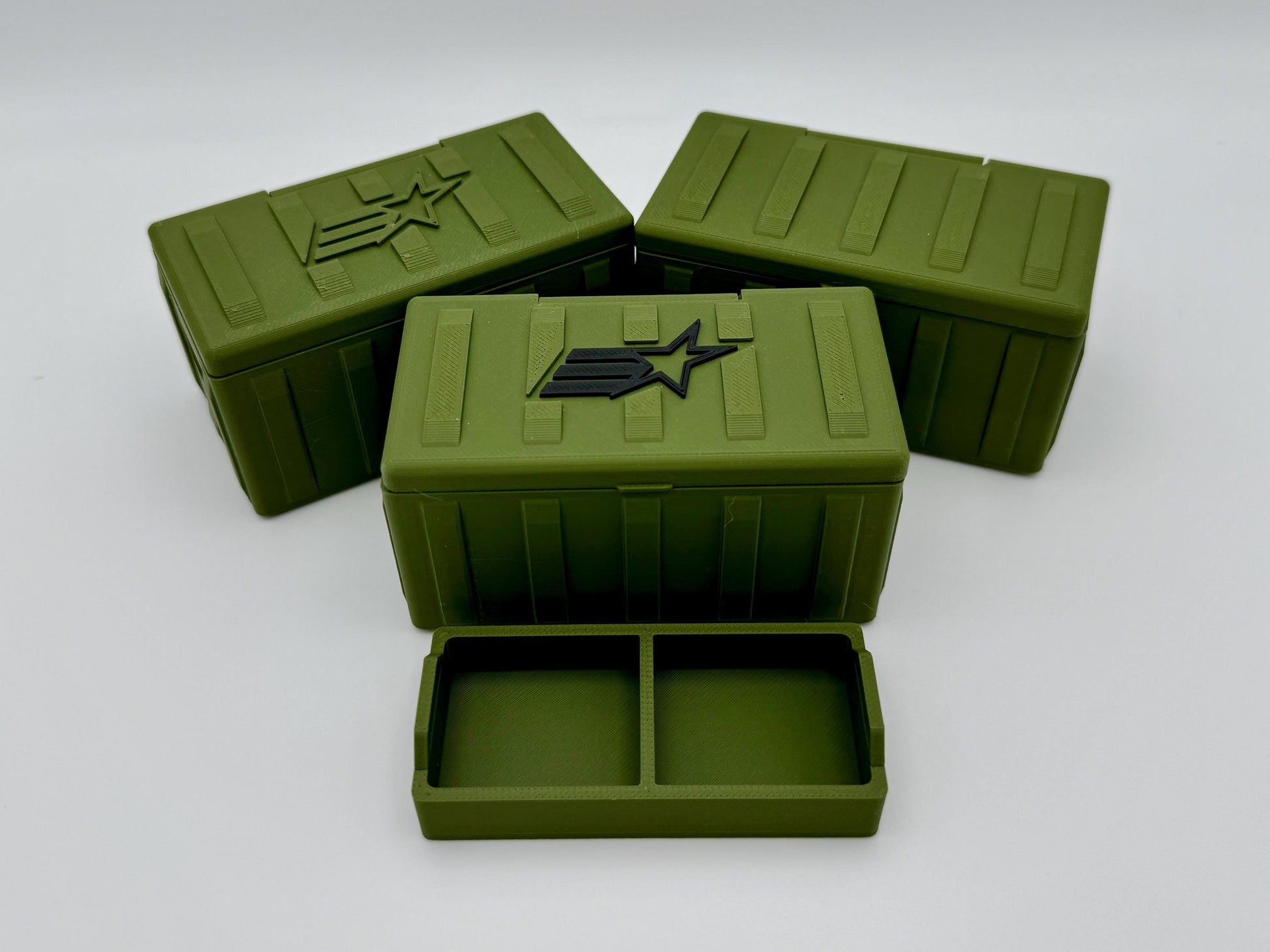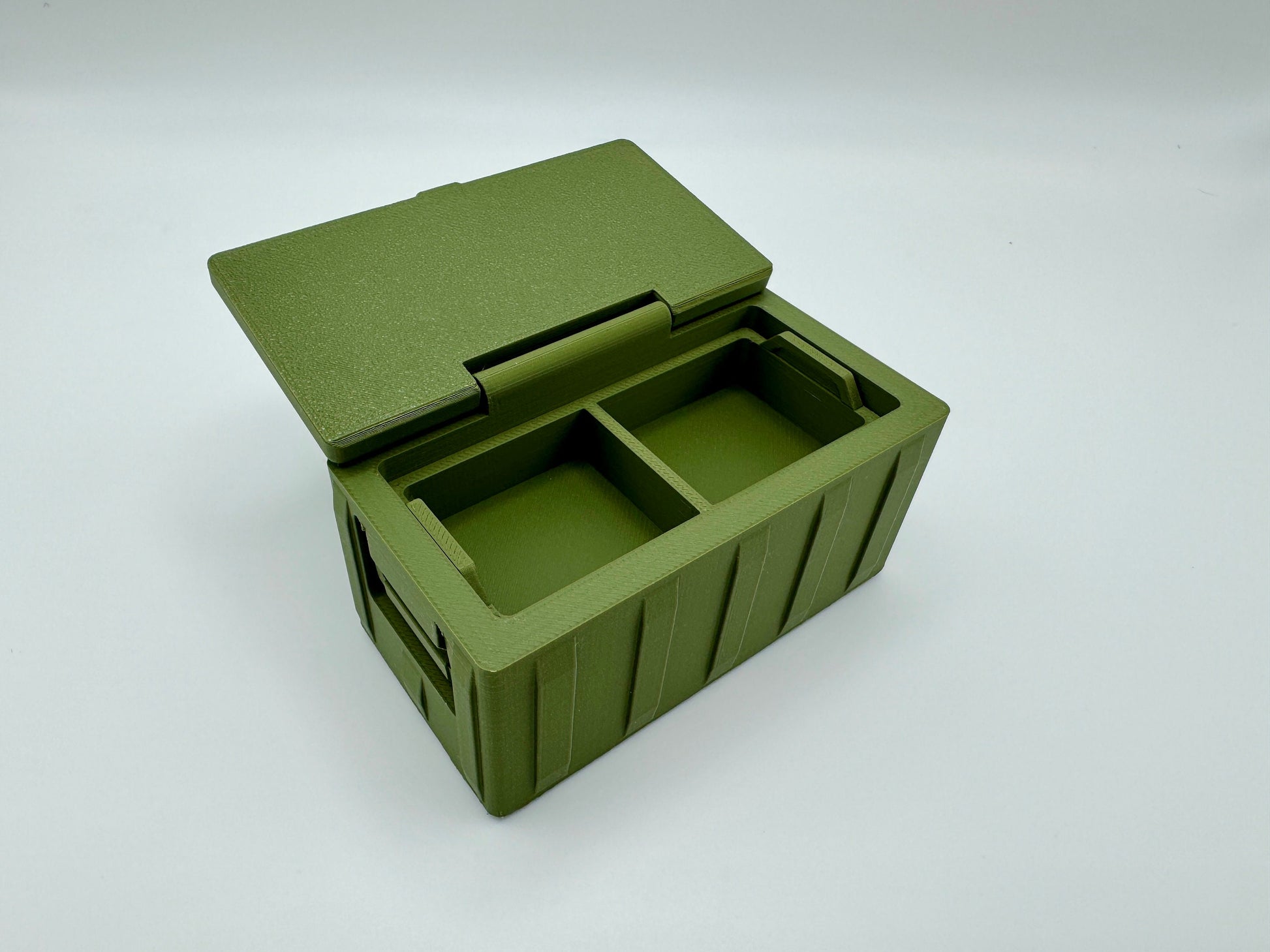 1:12 Scale crate is inspired by G.I. Joe Classified Series and is part of a series with multiple sizes that stack. Standard Issue is smaller and more true-to-scale than the Special Mission Crates. The hinge is designed for the best possible look, utilizing a ball-and-socket hinge. The handles fold flush into the sides of the crate.