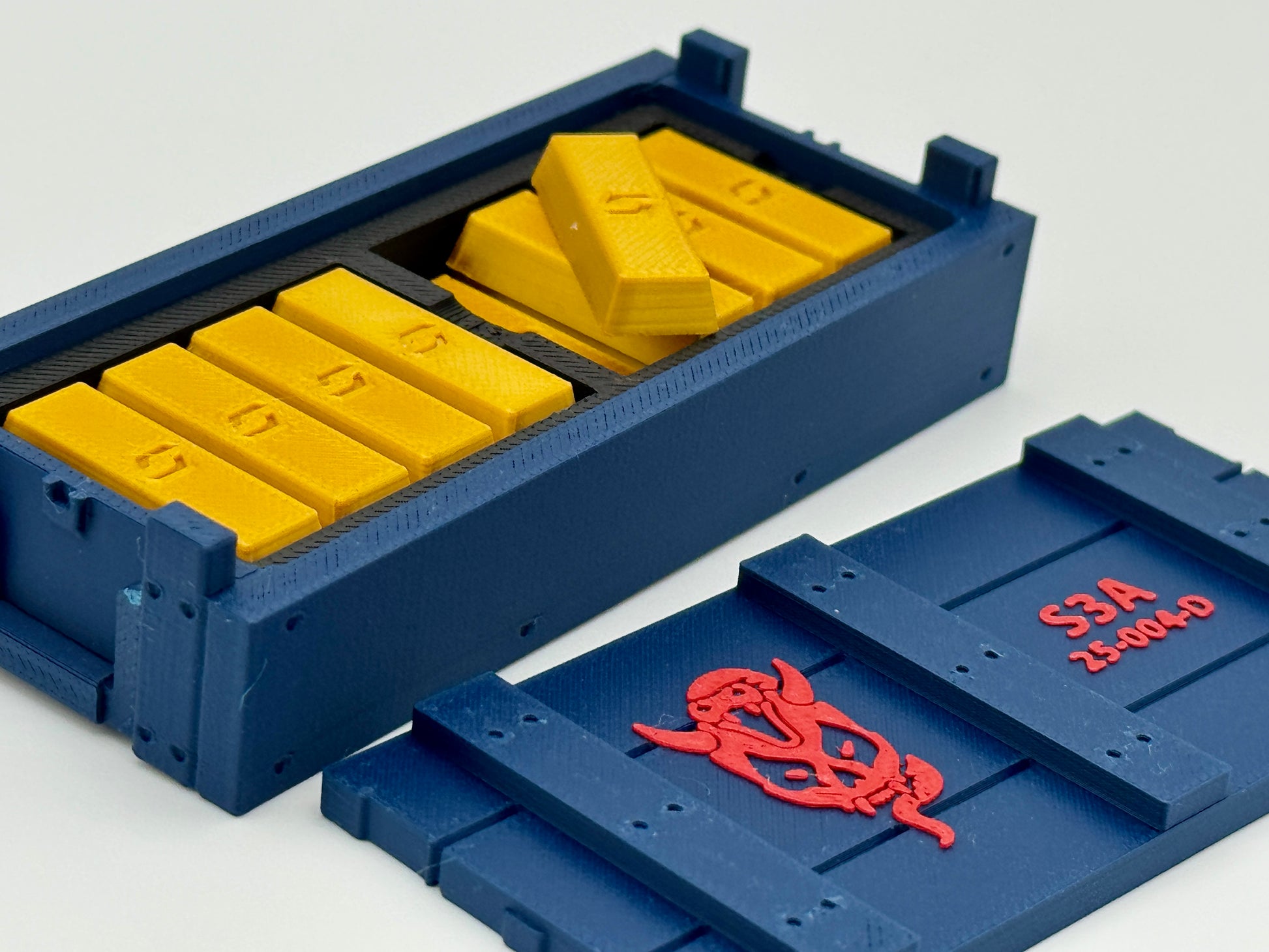 1:12 Scale crate inspired by G.I. Joe Classified Series and part of a multiple-size stacking crate series. Utility Crates are more true-to-scale when compared to Special Mission Crates. The Body-to-Lid notch secures the lid in place. The handles fold flush into the sides of the crate. The Utility Legacy crates are designed to replicate the look of classic military wood transport crates. A lot of details were added to give an authentic look. The case contains two sections for gold storage. Each section includes a prop gold bundle and a single loose bar.