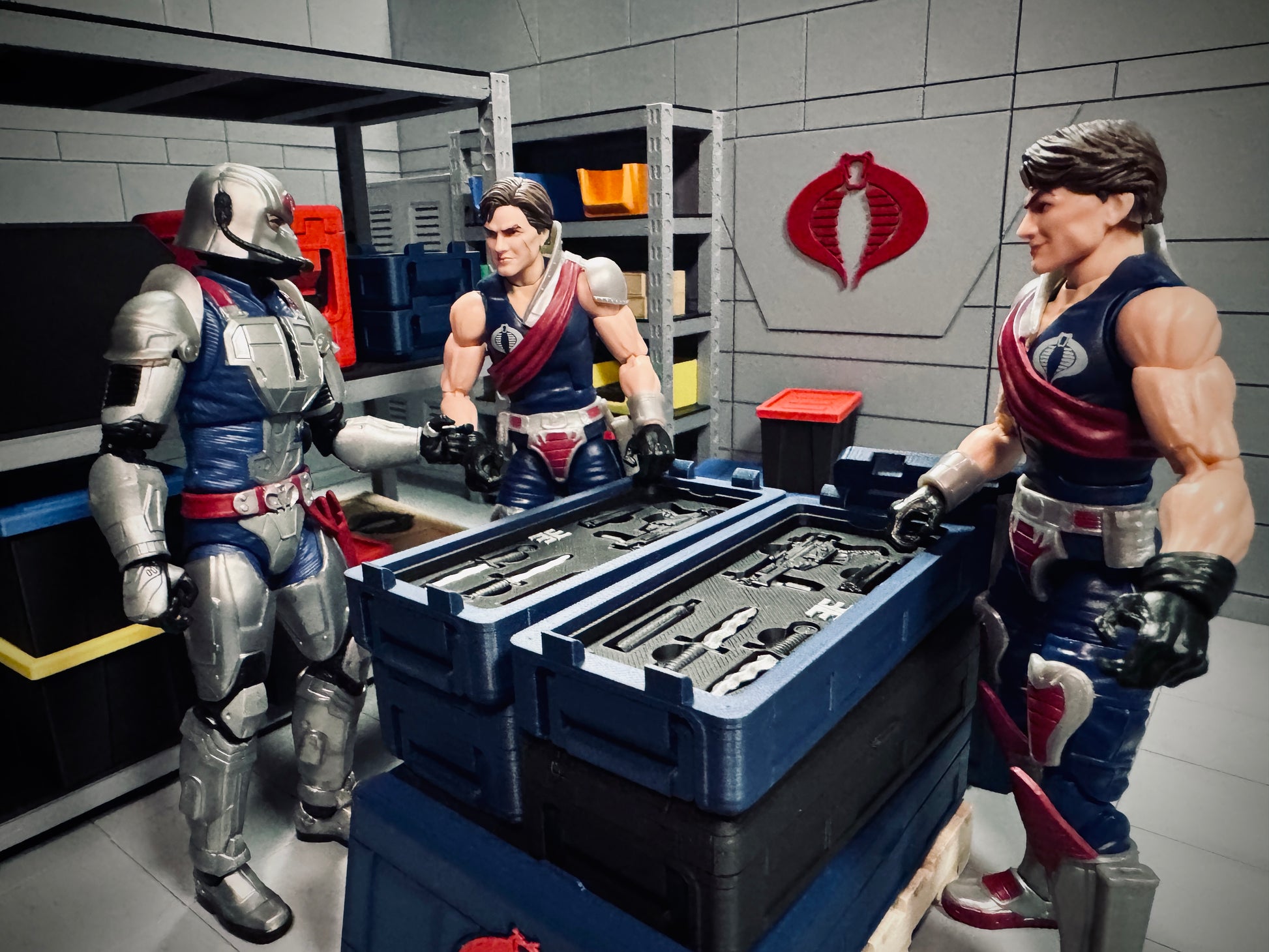 1:12 Scale crate inspired by G.I. Joe Classified Series and is part of a multiple-size stacking crate series. Tomax and Xamot were gifted custom crates by Cobra Commander for their devotion to him and his cause. The crates are mirrored just like the brothers. This crate also works with the Crimson Strike Team figures. Utility Crates are more true-to-scale when compared to Special Mission Crates. The Body-to-Lid notch secures the lid in place. The handles fold flush into the sides of the crate. The case contains five chemical/bio cylinders. The center of the cylinders is partially transparent.