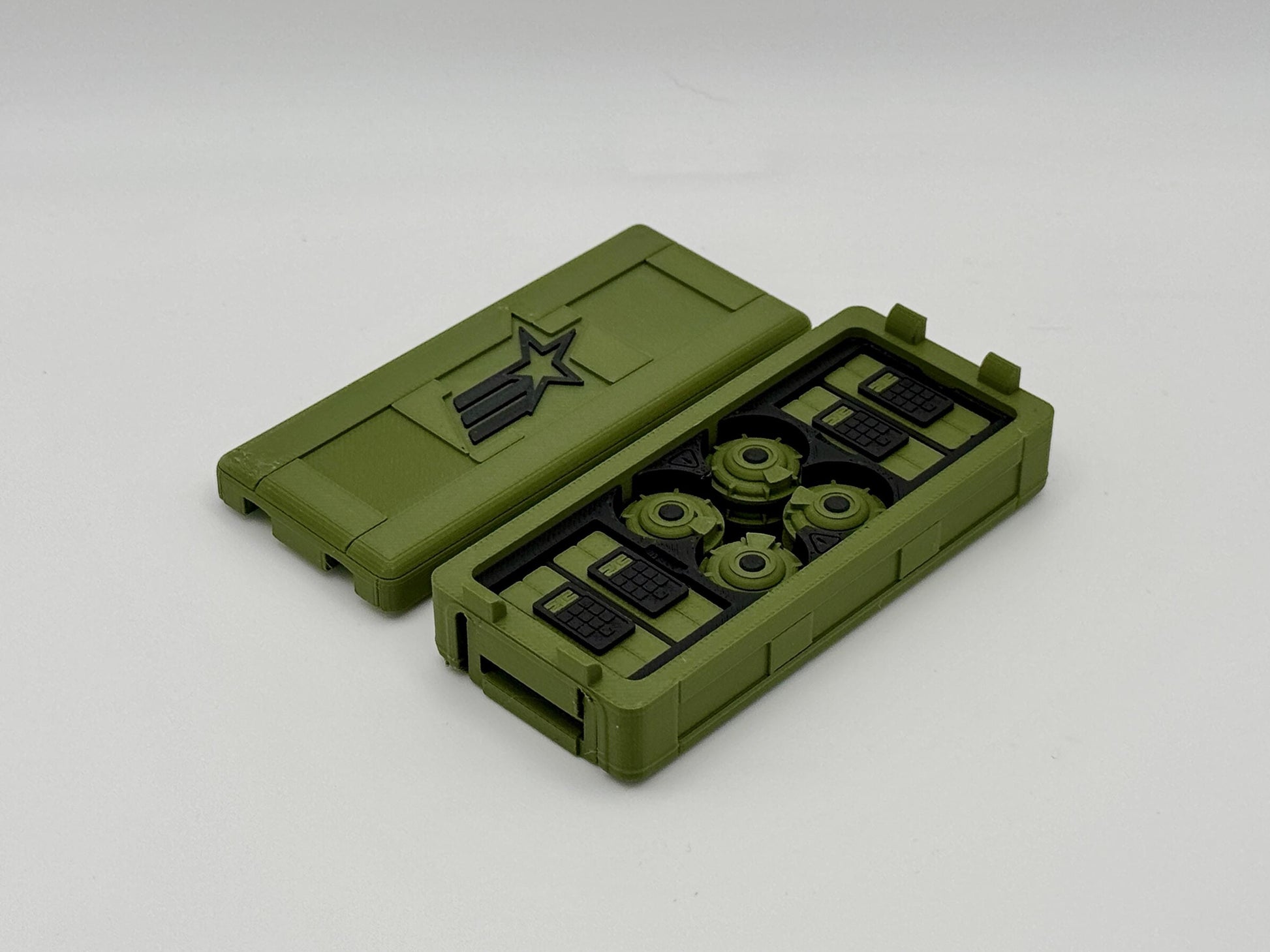 1:12 Scale crate inspired by G.I. Joe Classified Series and is part of a multiple-size stacking crate series. Utility Crates are more true-to-scale when compared to Special Mission Crates. The Body-to-Lid notch secures the lid in place. The handles fold flush into the sides of the crate.