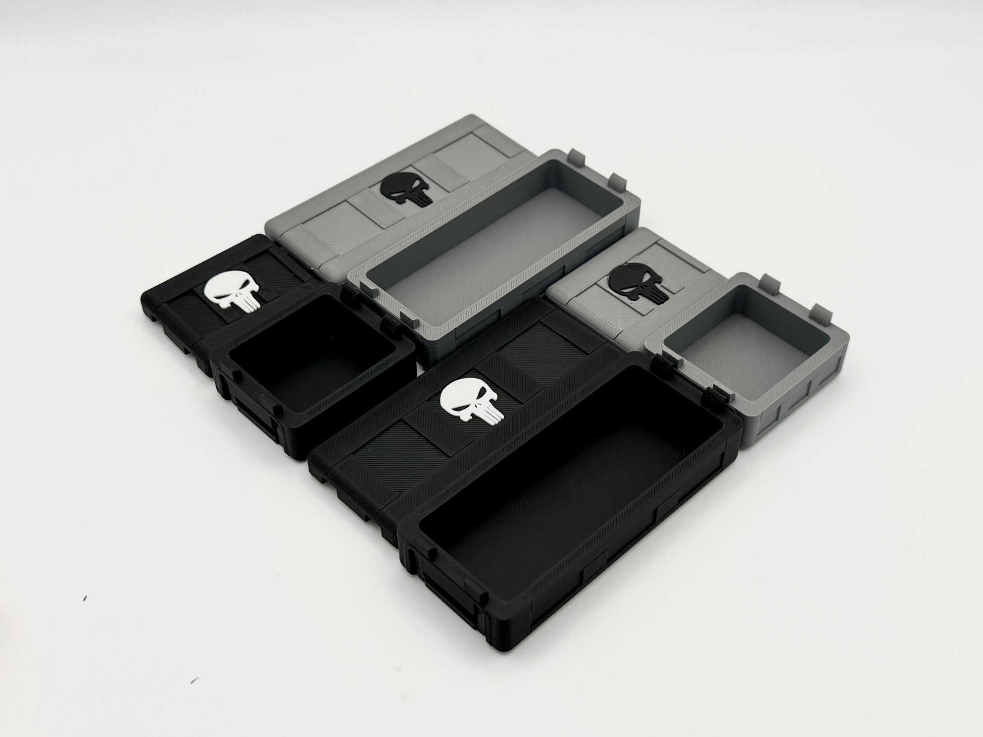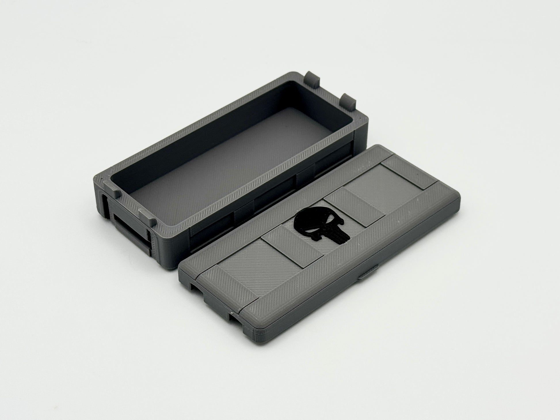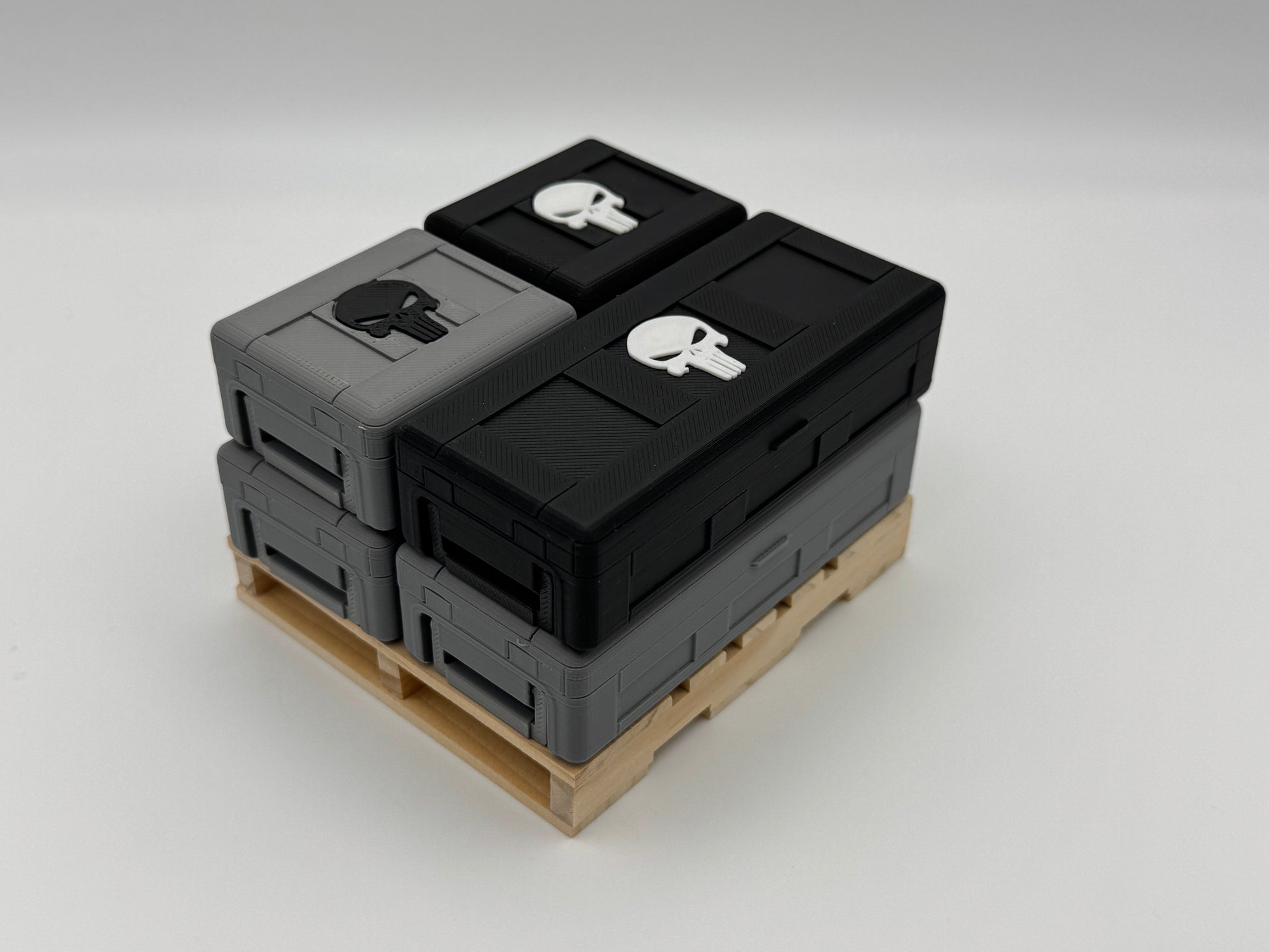 1:12 Scale crate inspired by G.I. Joe Classified Series and is part of a multiple-size stacking crate series. Standard Issue is smaller and more true-to-scale than the Special Mission Crates. The Body-to-Lid notch secures the lid in place. The handles fold flush into the sides of the crate.