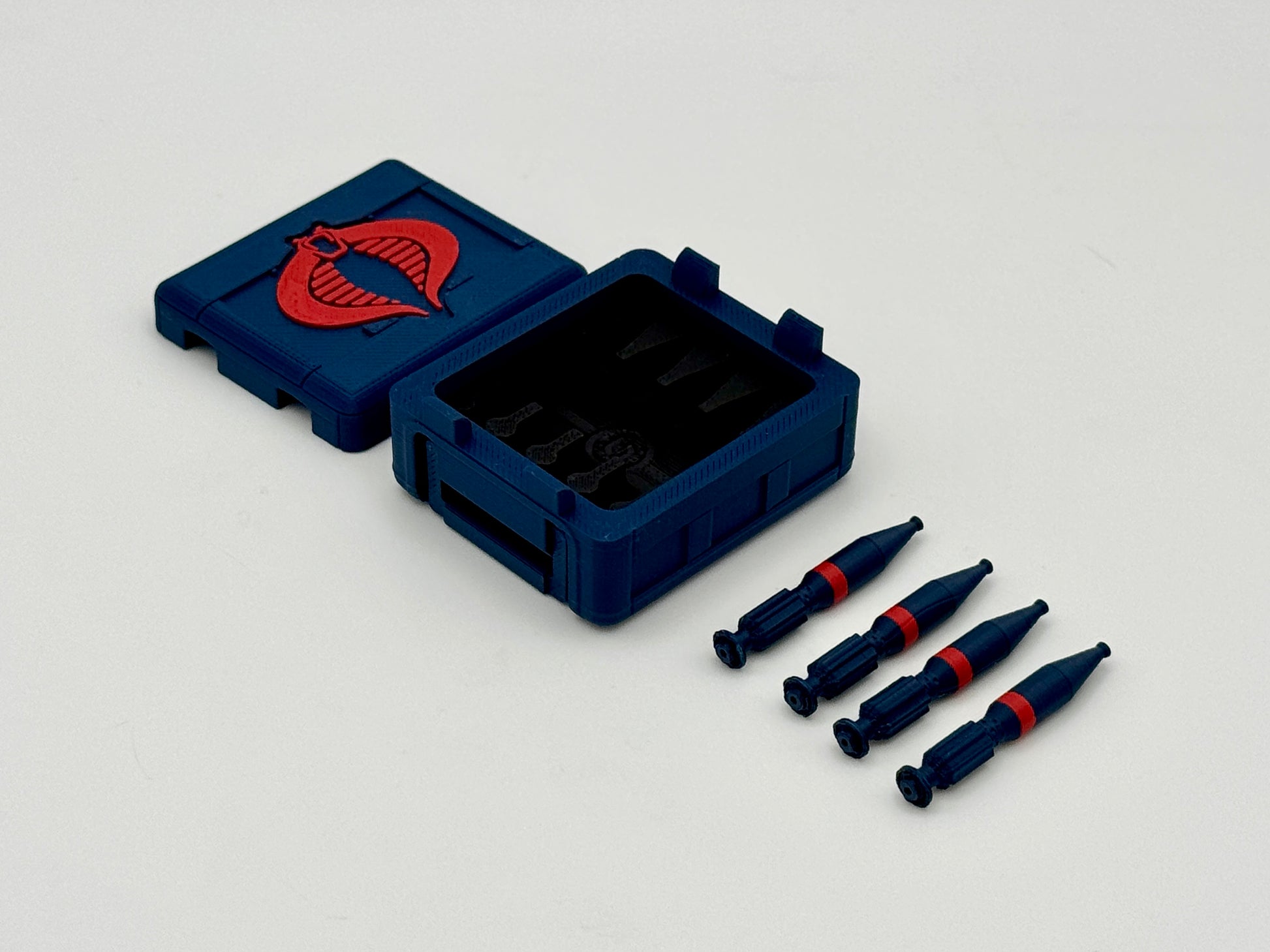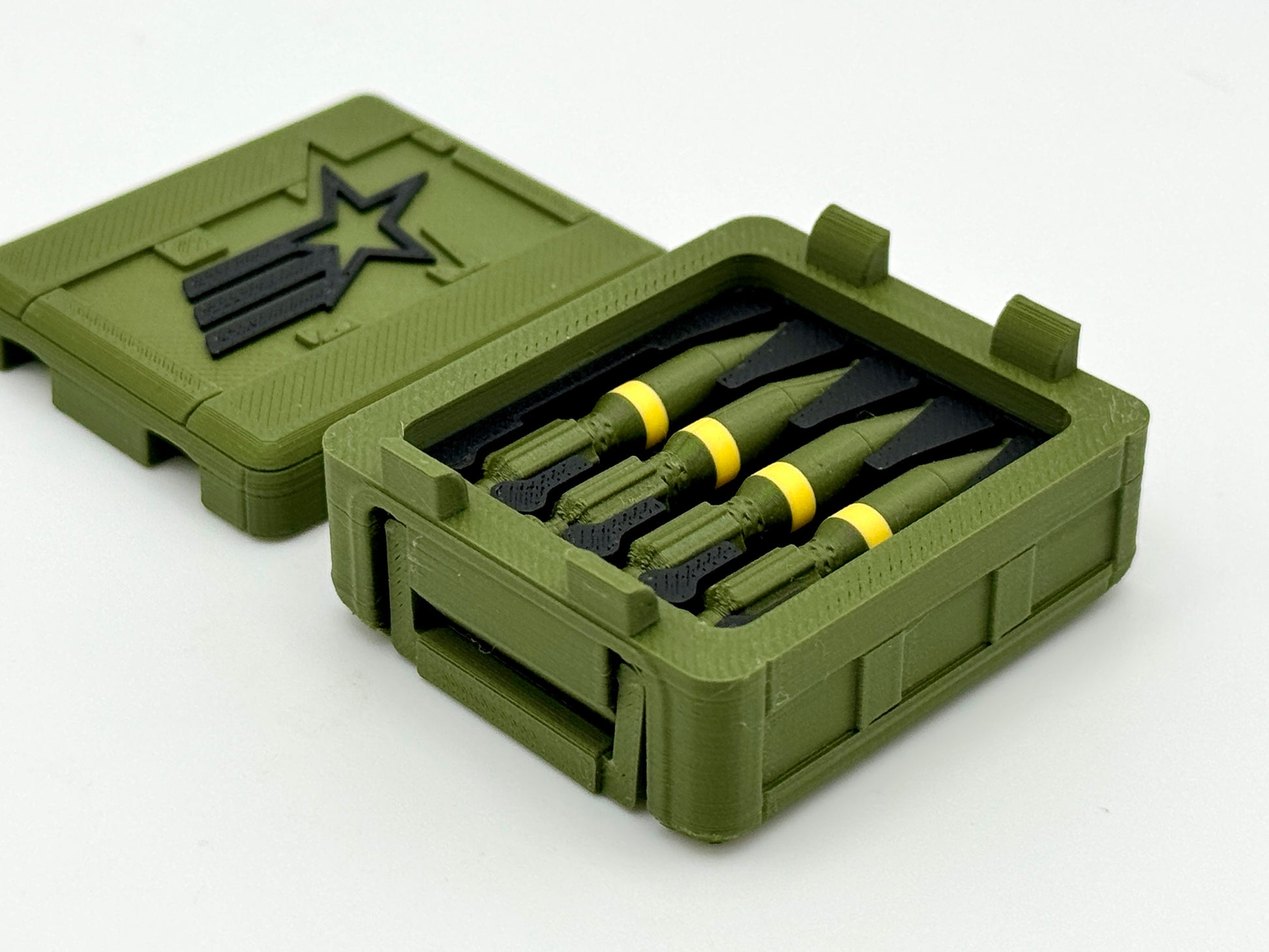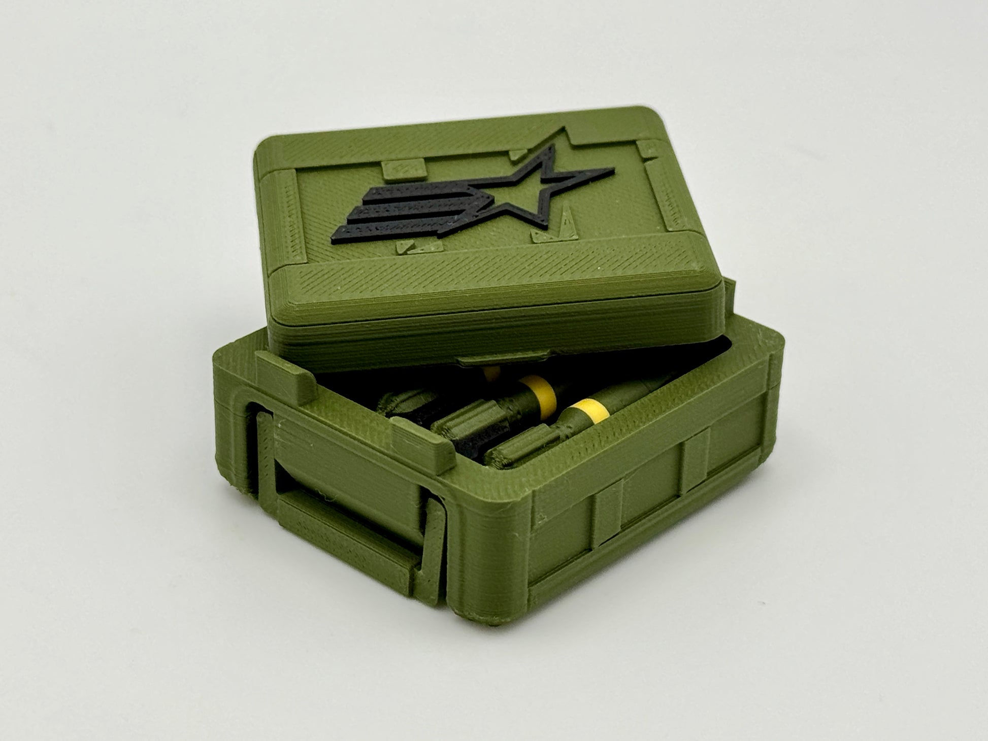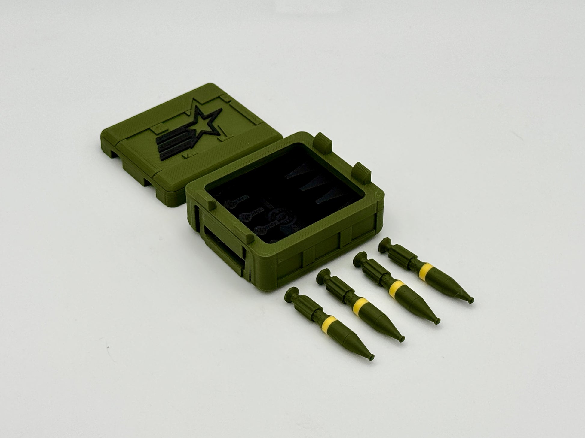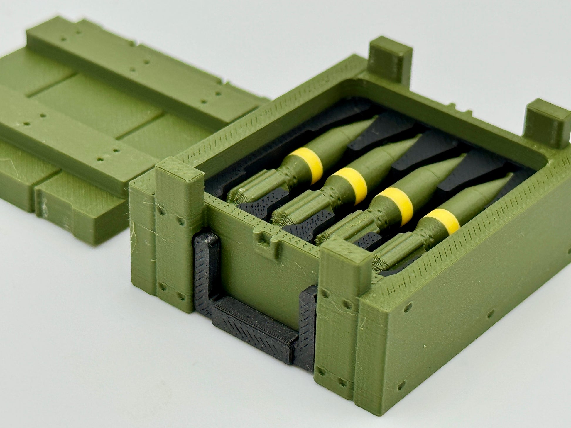 1:12 Scale crate inspired by G.I. Joe Classified Series and is part of a multiple-size stacking crate series. Standard Issue is smaller and more true to scale than the Special Mission Crates. The Body-to-Lid notch secures the lid in place. The handles fold flush into the sides of the crate. This crate is designed to hold four mortar rounds in a snug-fitting "foam" to protect them while en route to the mission.